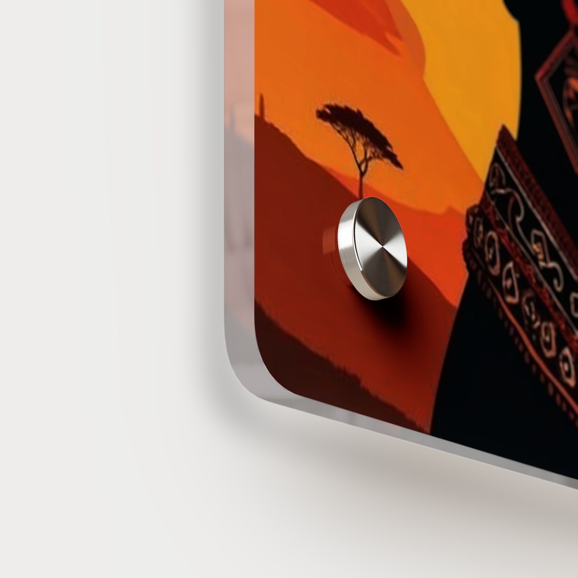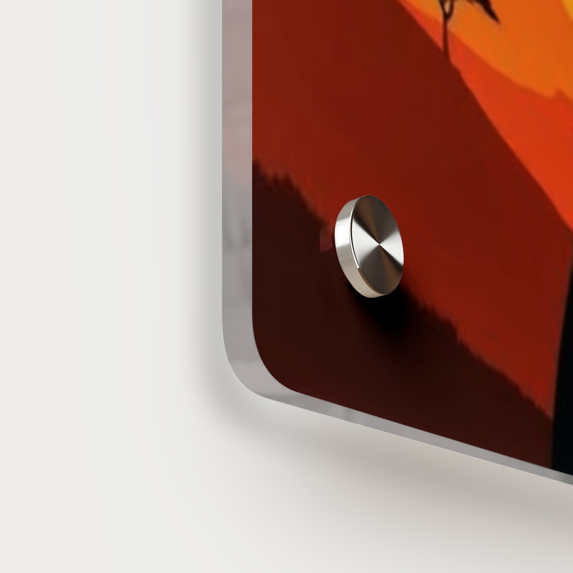 Acrylic art panels are a modern way to display beautiful and vibrant art that looks like it's embedded in clear glass. They have a clear, glossy acrylic surface and a white vinyl backing. Four silver stand-offs make it very easy to mount to the wall. Make your own original designs and print them on any (or all) of the seven available panel sizes in horizontal and vertical orientations. Square dimensions are available.