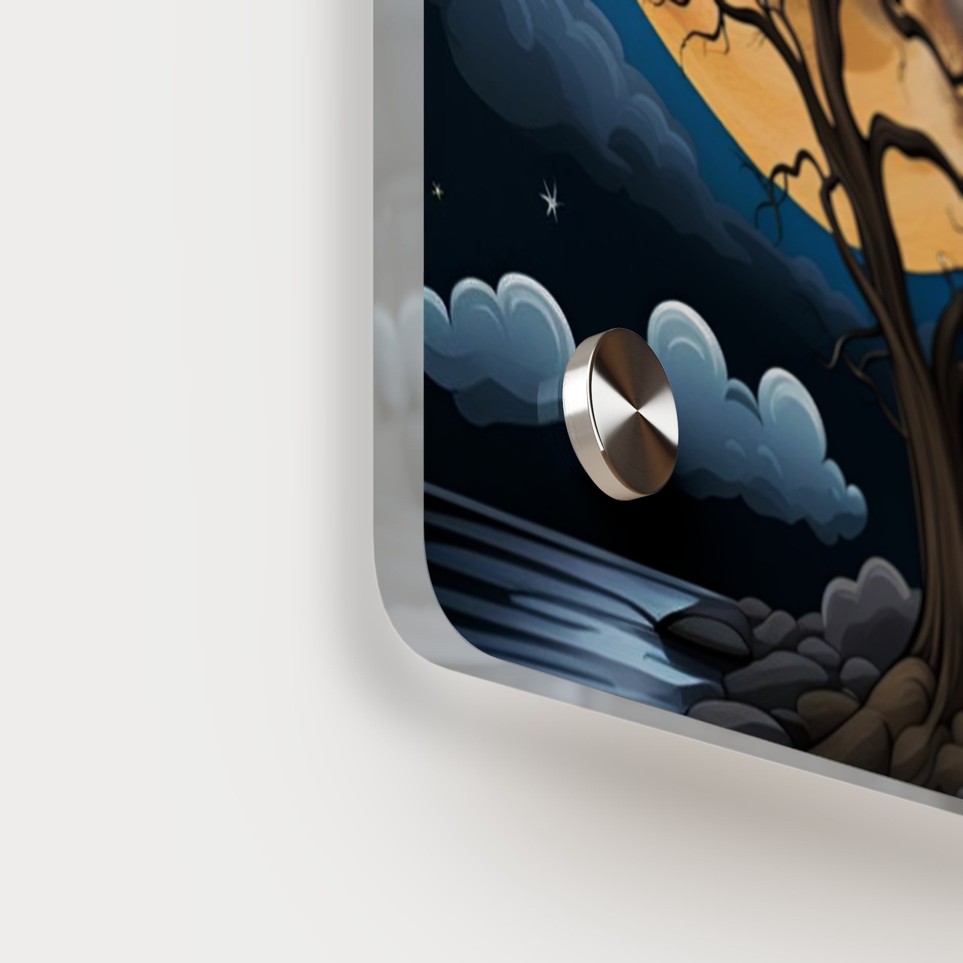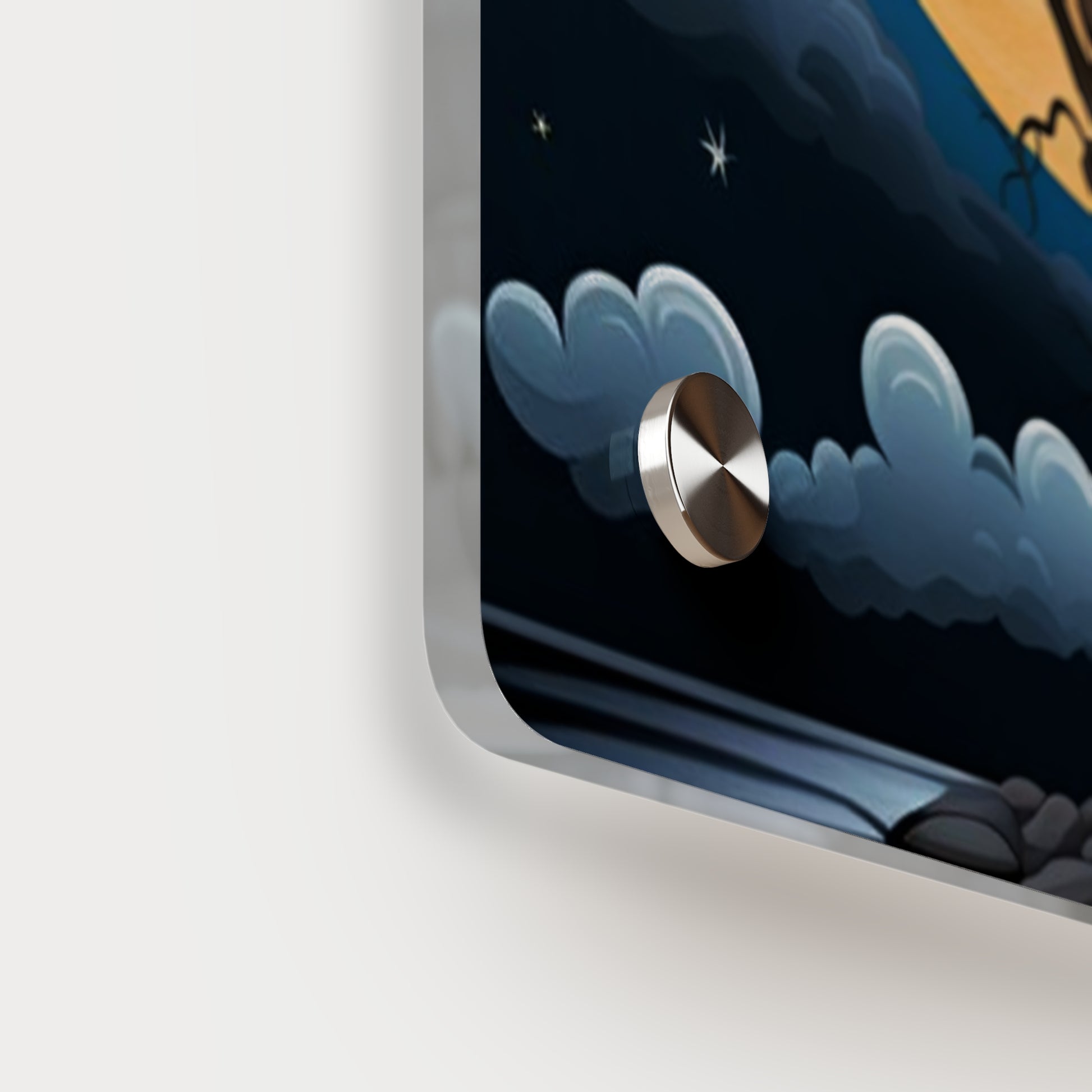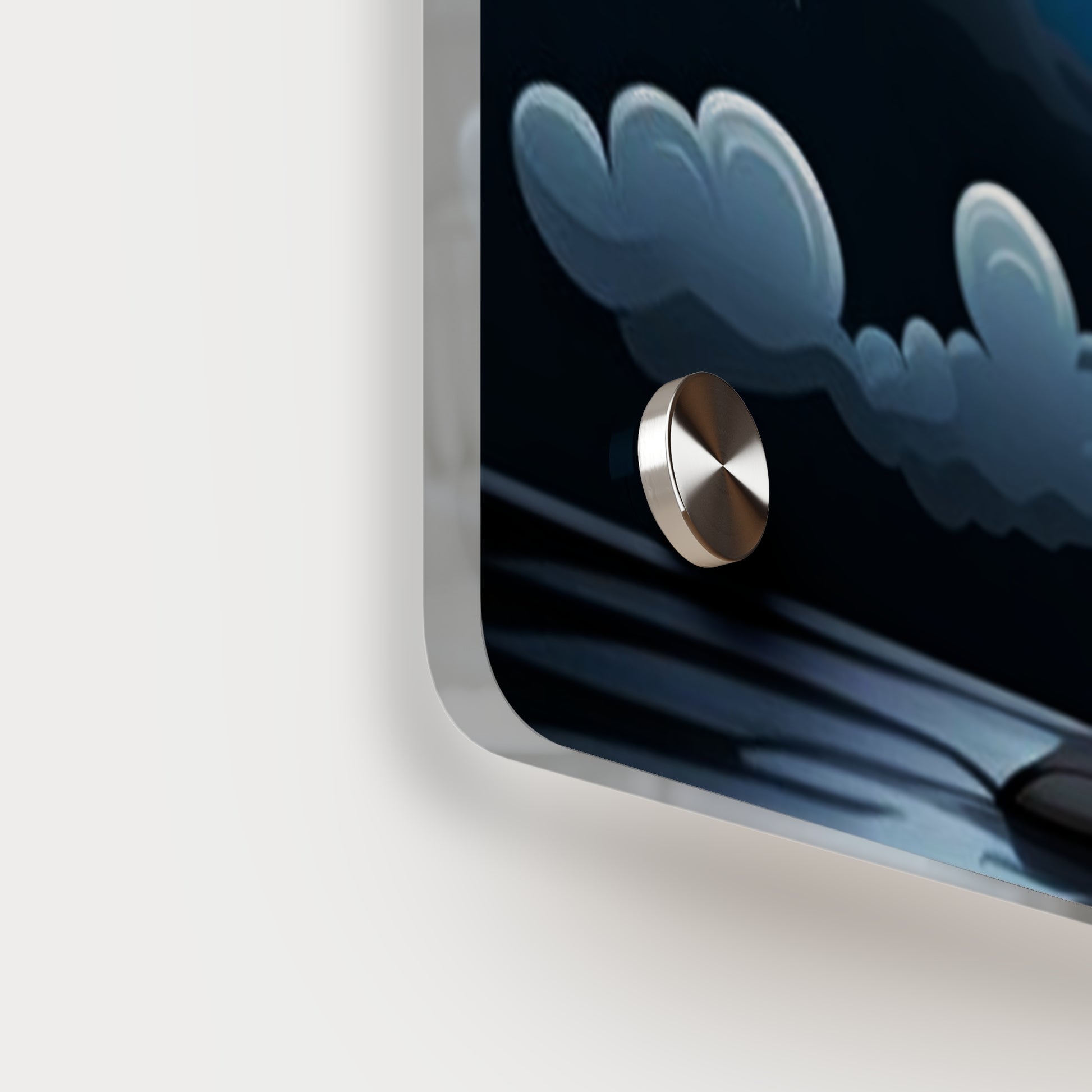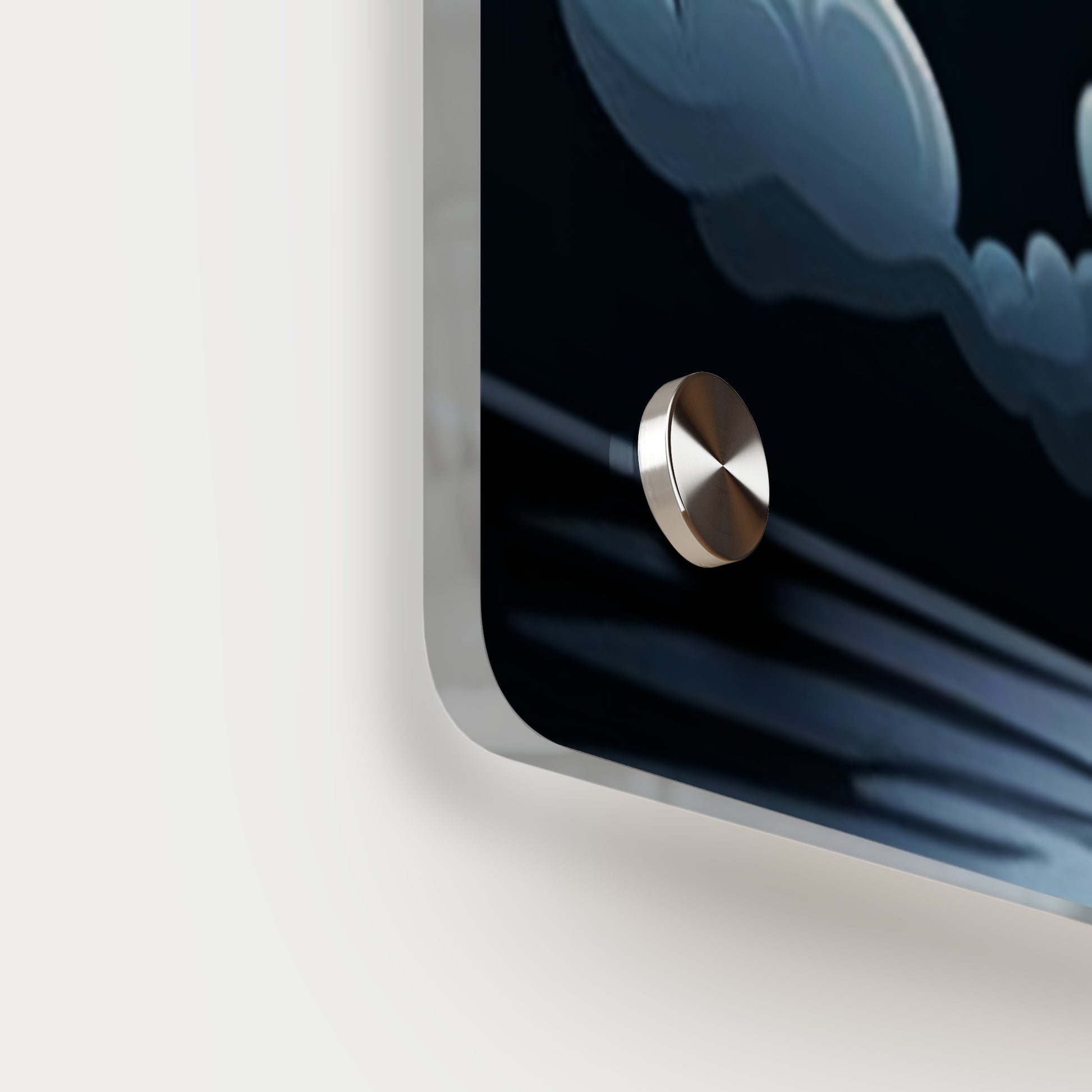 Acrylic art panels are a modern way to display beautiful and vibrant art that looks like it's embedded in clear glass. They have a clear, glossy acrylic surface and a white vinyl backing. Four silver stand-offs make it very easy to mount to the wall. Make your own original designs and print them on any (or all) of the seven available panel sizes in horizontal and vertical orientations. Square dimensions are available.