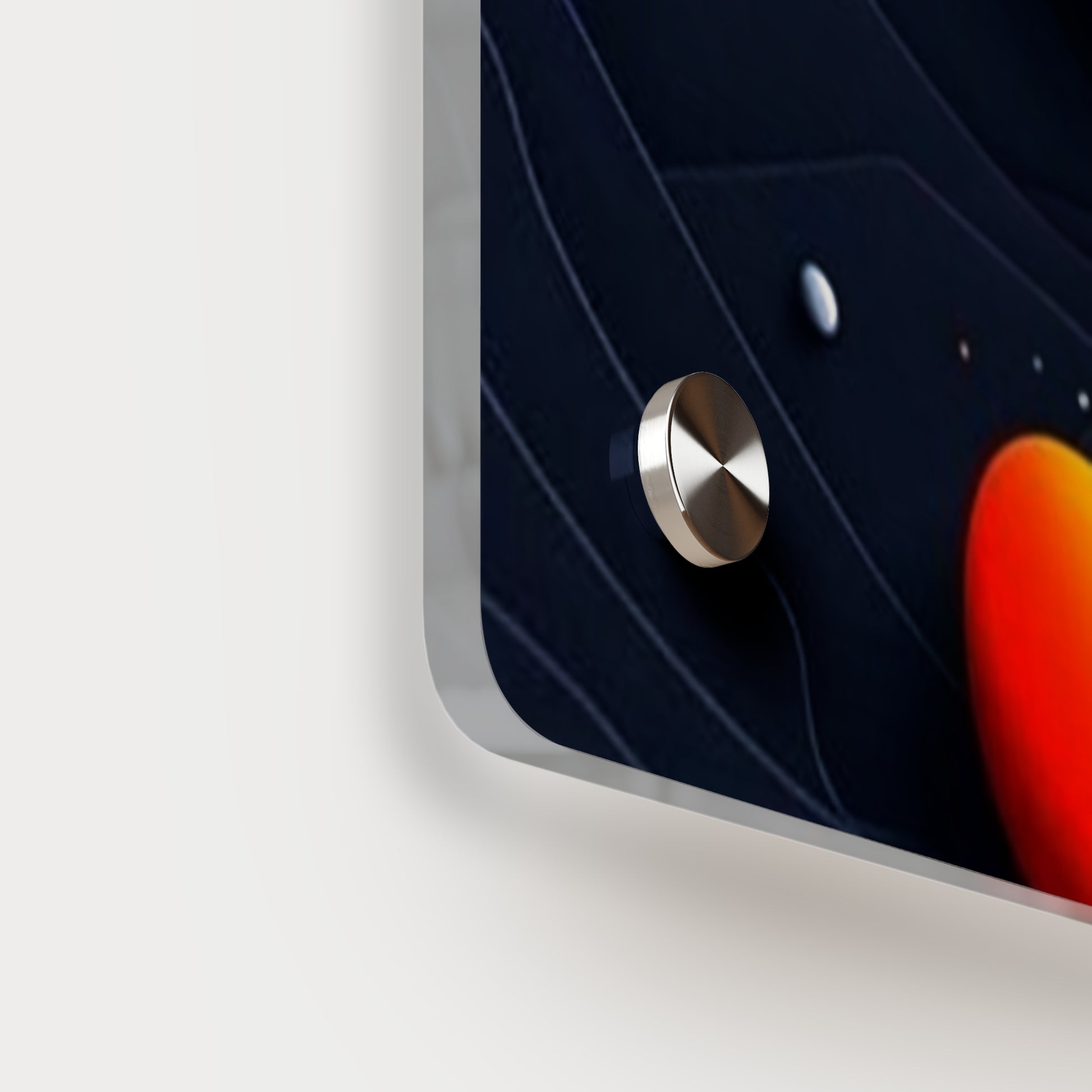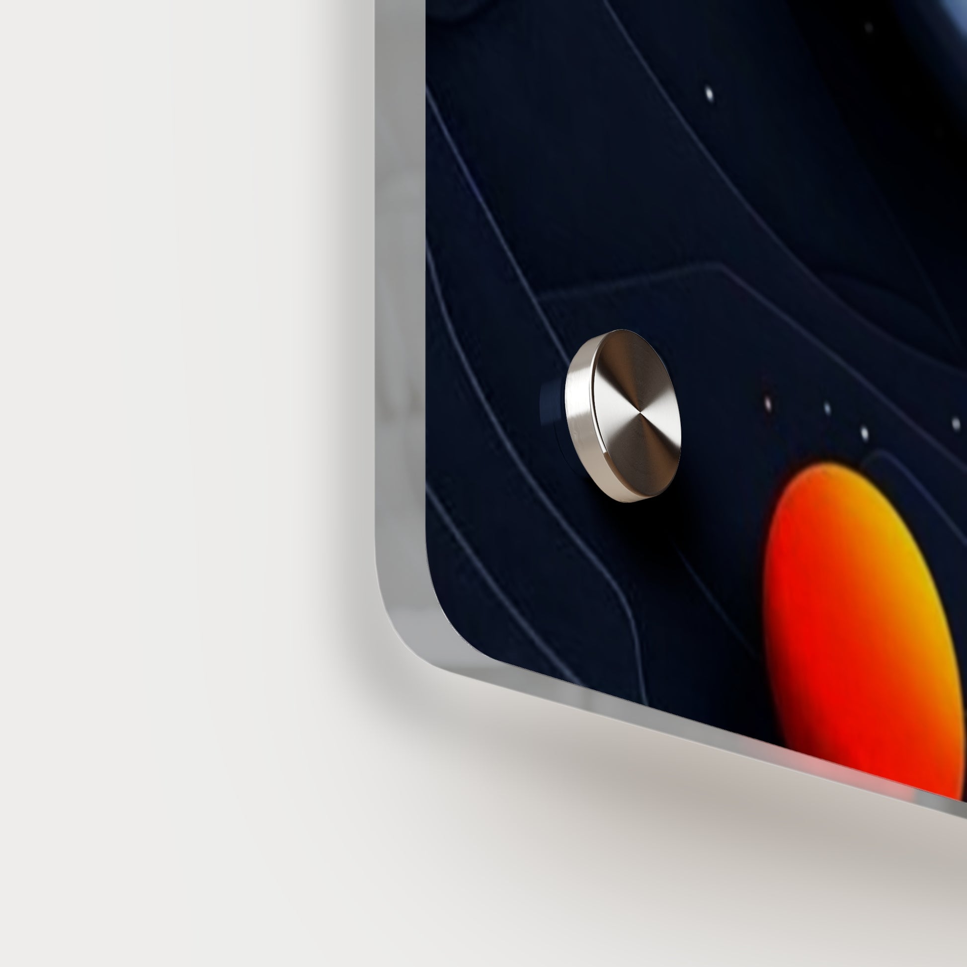 Acrylic art panels are a modern way to display beautiful and vibrant art that looks like it's embedded in clear glass. They have a clear, glossy acrylic surface and a white vinyl backing. Four silver stand-offs make it very easy to mount to the wall. Make your own original designs and print them on any (or all) of the seven available panel sizes in horizontal and vertical orientations. Square dimensions are available.